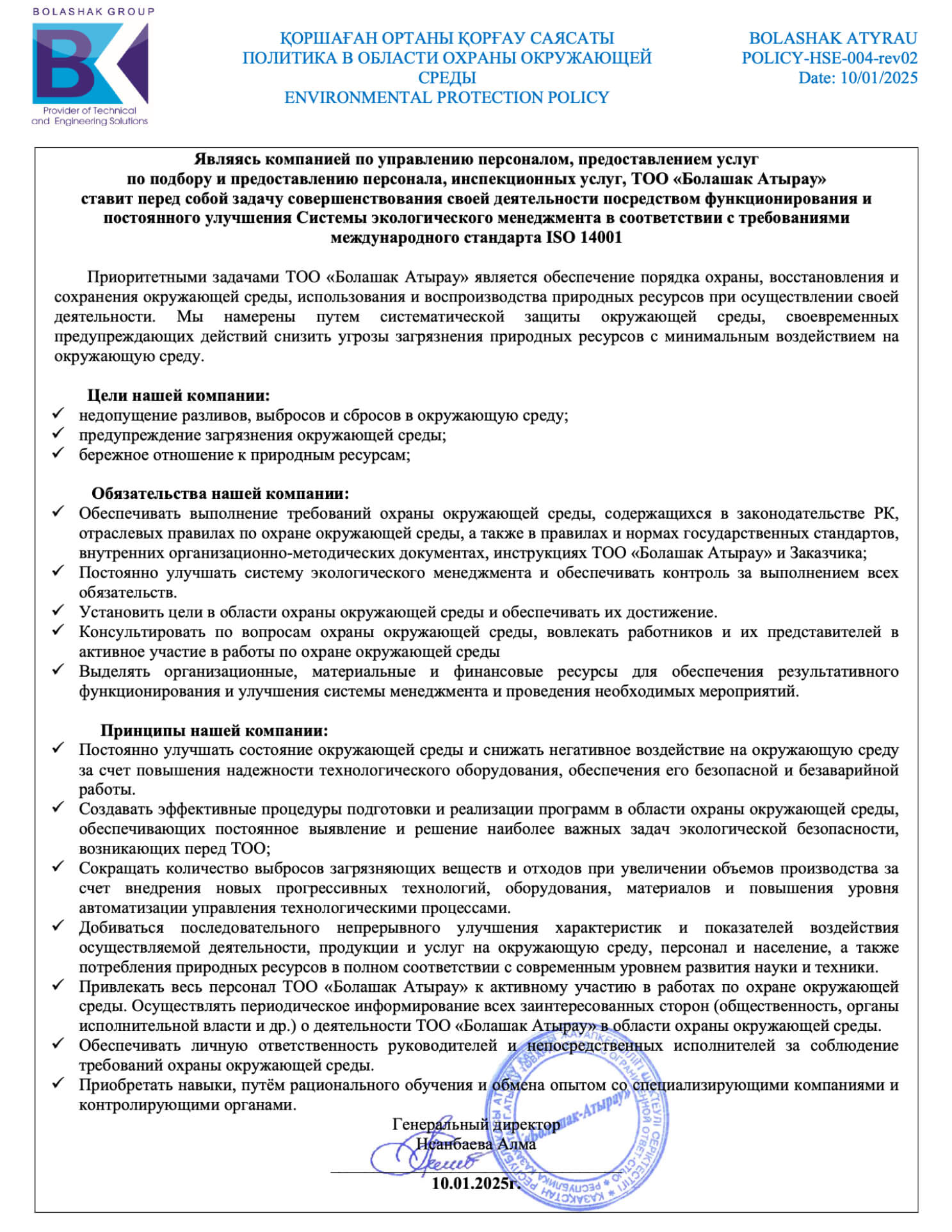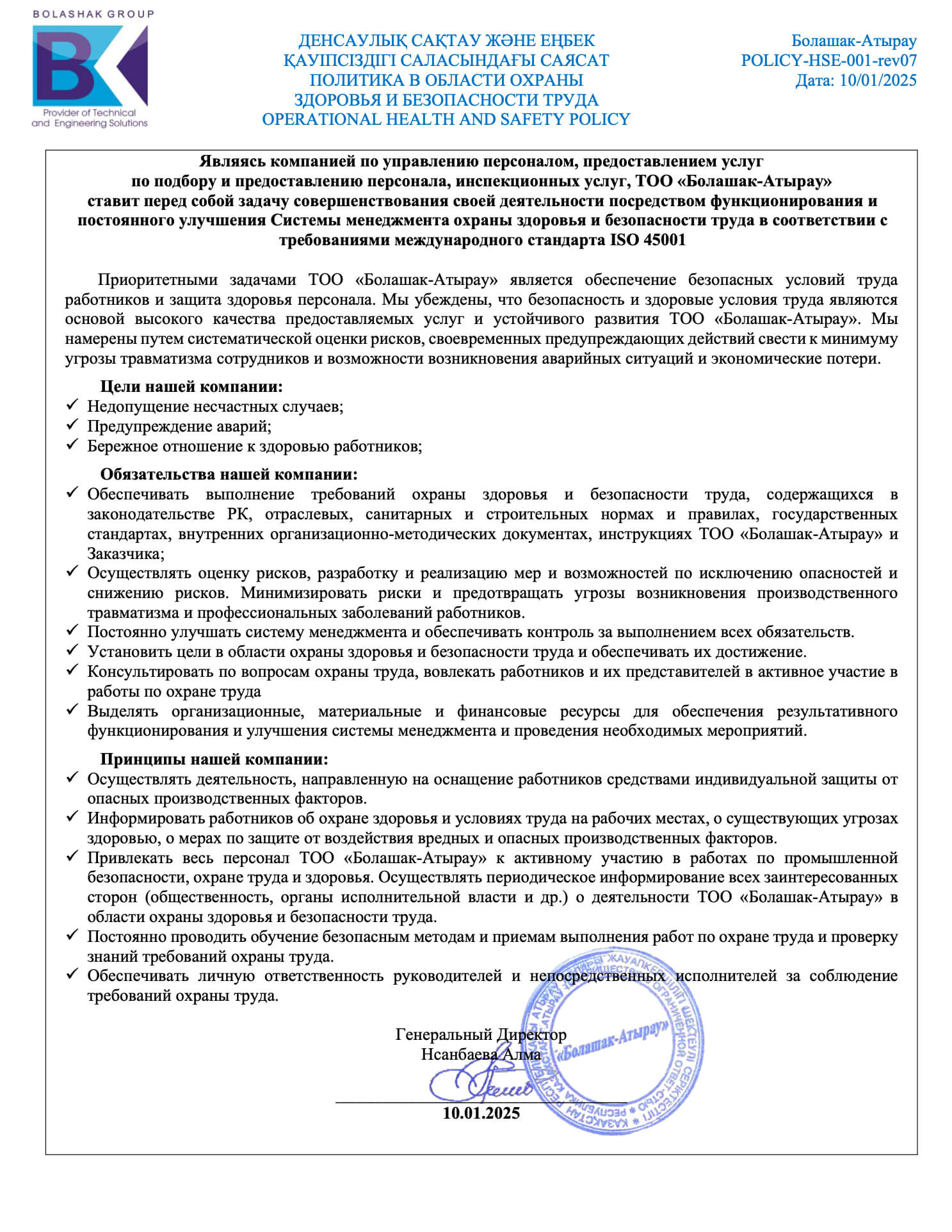 • Болашак берет на себя ответственность внедрить продвижение и практическое применение своих политик в области охраны здоровья, техники безопасности и охраны окружающей среды.